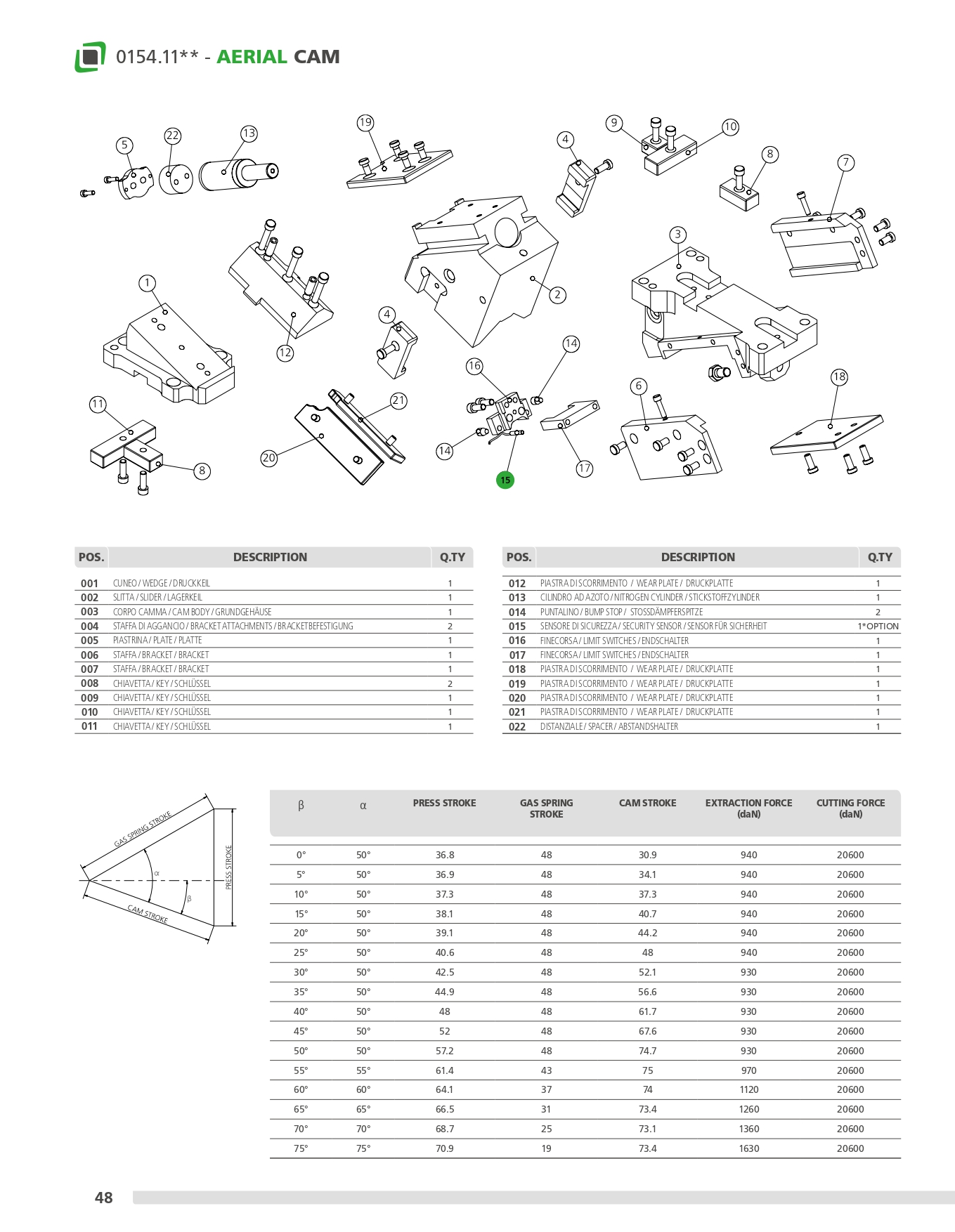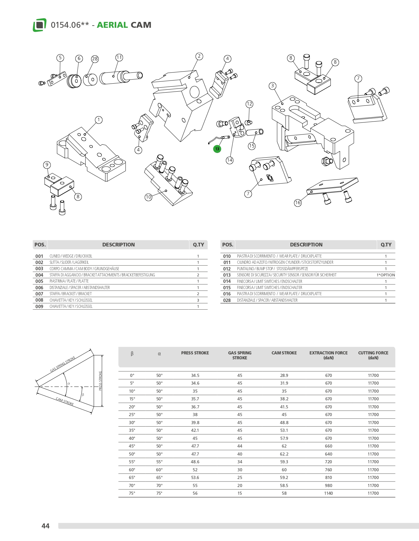 Mechanical cam with power supply up to 88200 daN with return by nitrogen cylinders, on which are applied accessories or steel, to perform required work. This cam can be fitted horizontally or inclined from 0° to 75°. Means of application: generally suitable for shearing, drilling and bending work. Replaceable VDI.