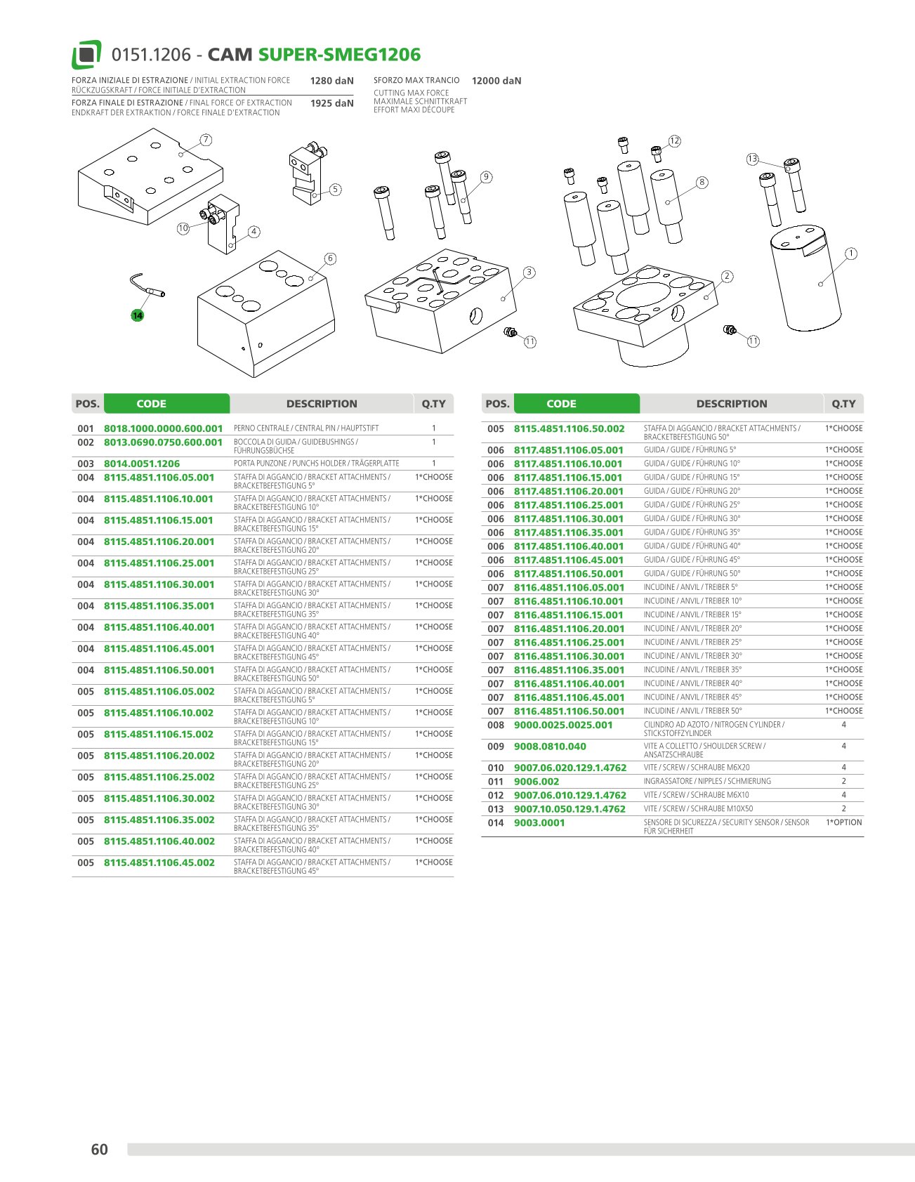 Mechanical cam with a power of up to 60.000 daN with guaranteed re turn through nitrogen cylinders, on which the accessories or steels are applied to perform the desired machining operations. This cam is mounted at an angle of 5° to 50° from the vertical. Means of application: generally suitable for cutting, drilling and bending works.