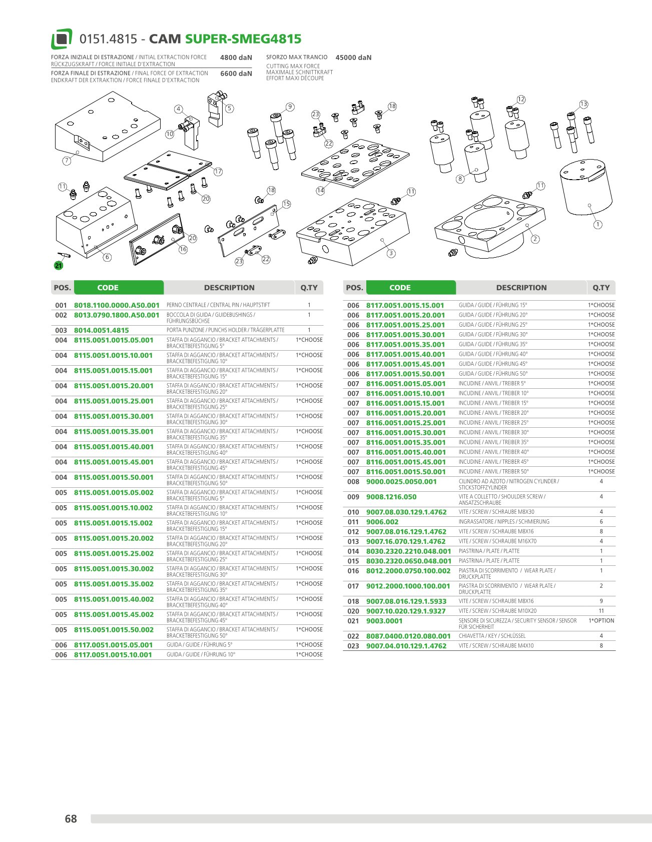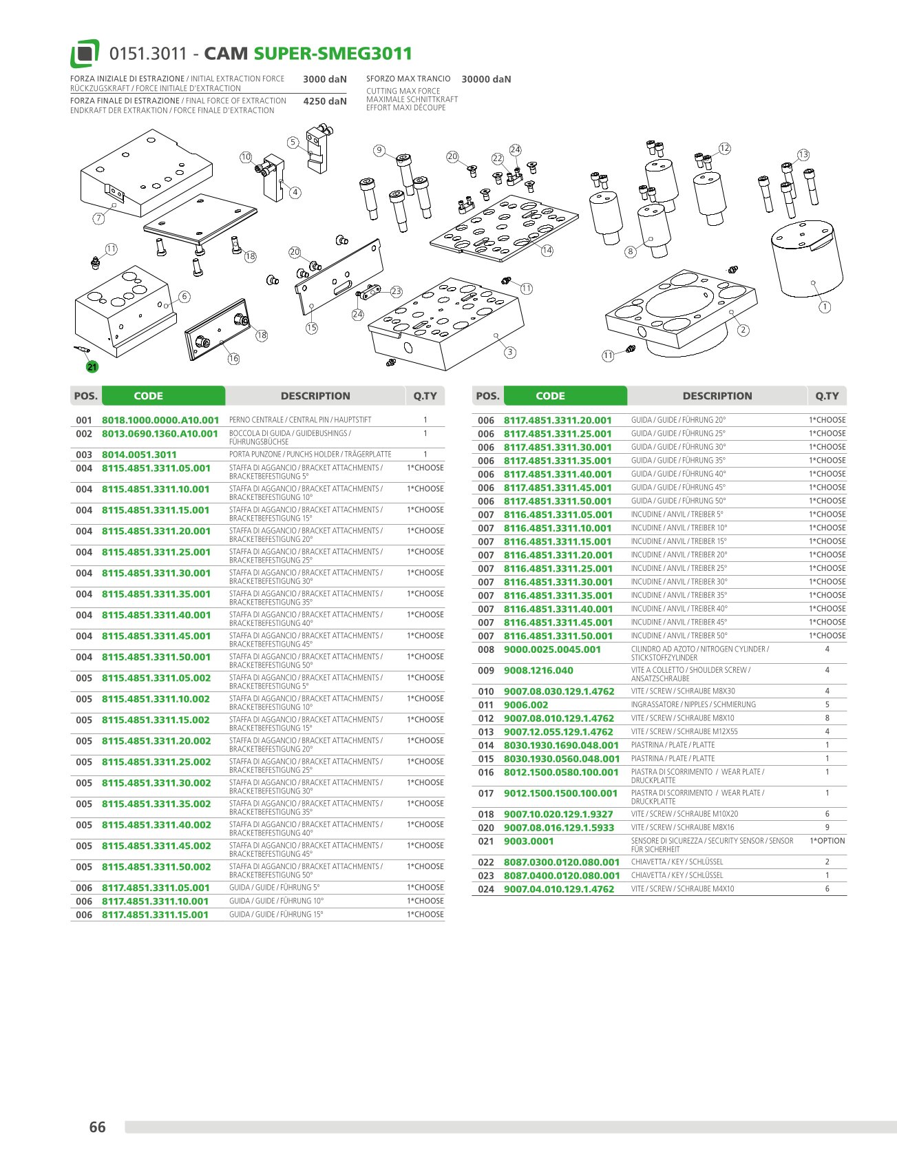 Mechanical cam with a power of up to 60.000 daN with guaranteed re turn through nitrogen cylinders, on which the accessories or steels are applied to perform the desired machining operations. This cam is mounted at an angle of 5° to 50° from the vertical. Means of application: generally suitable for cutting, drilling and bending works.