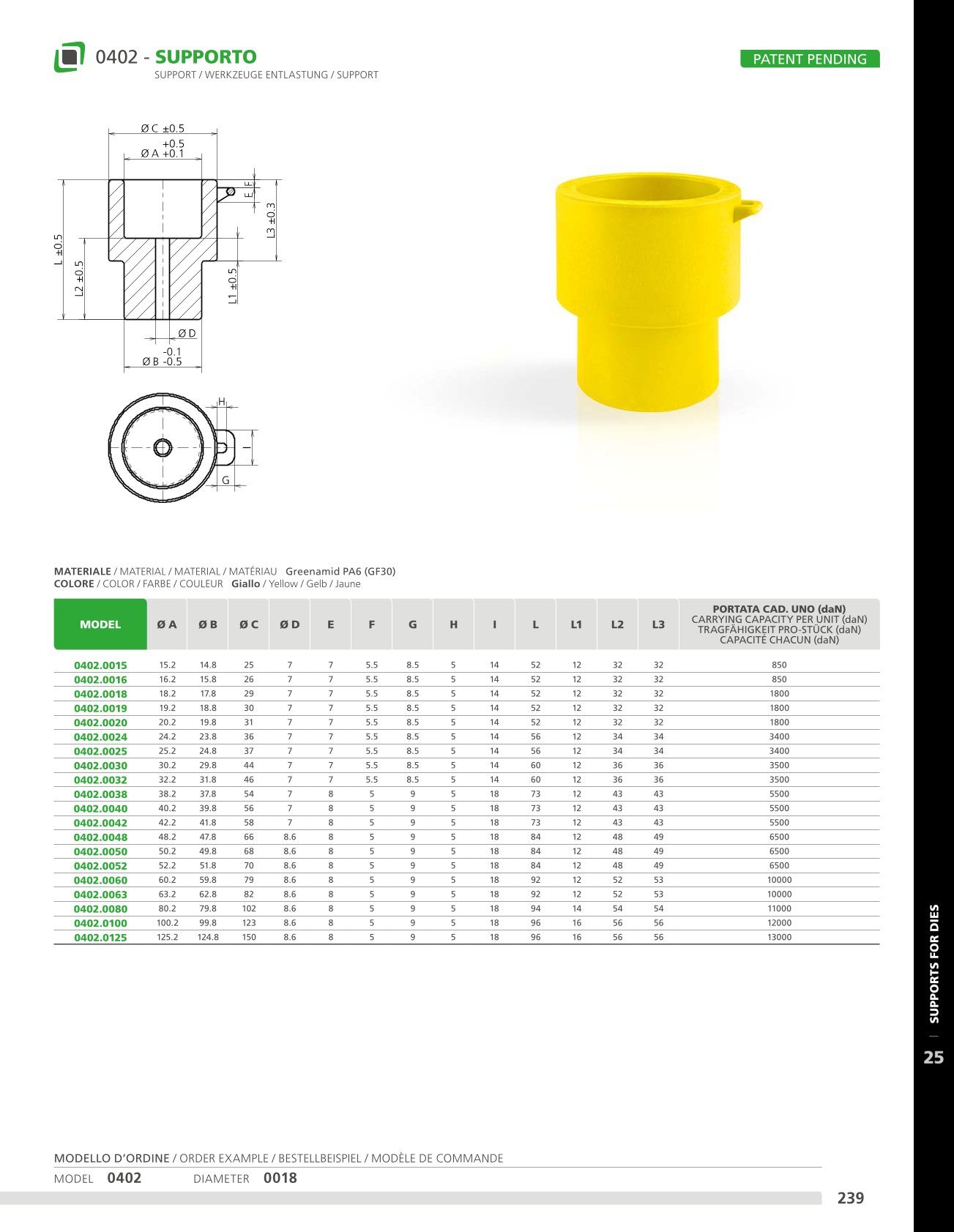 Diseñado y construido para el almacenamiento y transporte del troquel. Los soportes mantienes los muelles y los cilindros desactivados, evitando su sobrecarga y alargando su durabilidad. Es esencial para la protección de los troqueles, ya que hay un perfecto centrado entre el casquillo y la columna. Cada «SSD» tiene una capacidad de carga proporcional al peso del troquel. Su color amarillo atrae la atención del operario incrementando la seguridad en su uso