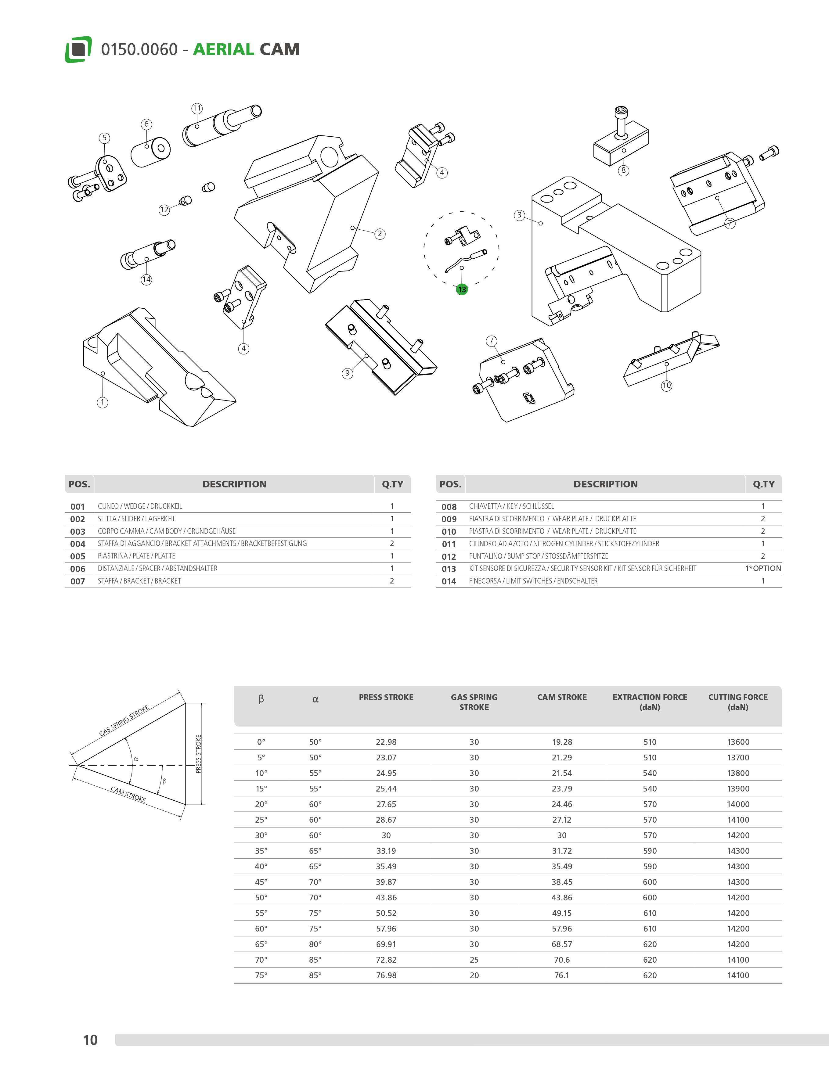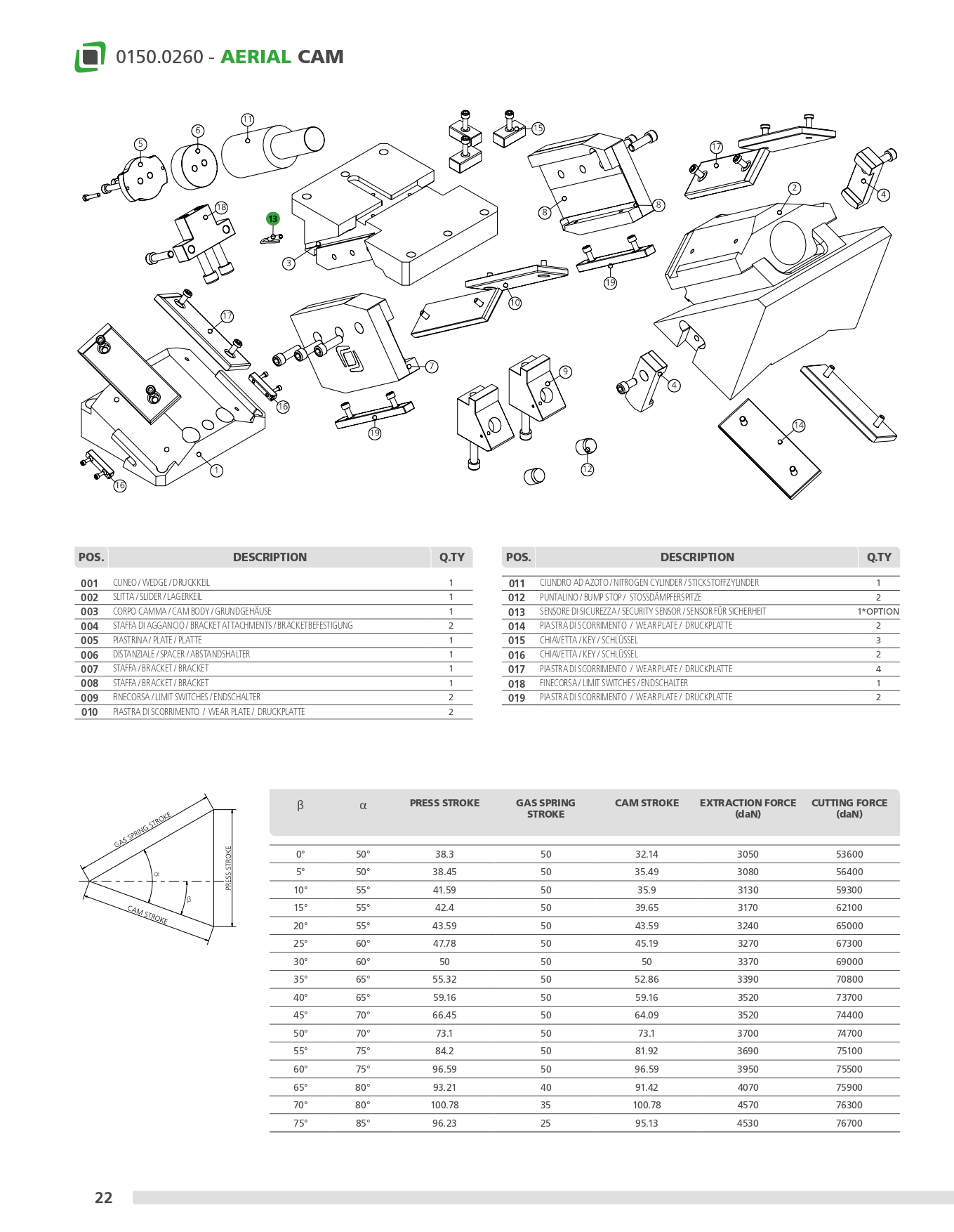 Came mécanique d’une puissance allant jusqu’à 120200 daN avec retour garanti au moyen de vérins à azote, sur lequel sont appliqués les accessoires ou les aciers pour réaliser les usinages souhaités. Cette came peut être montée en position horizontale ou inclinée de 0° à 75°. Applications possibles: convient pour les travaux de découpage, de perçage et de pliage.