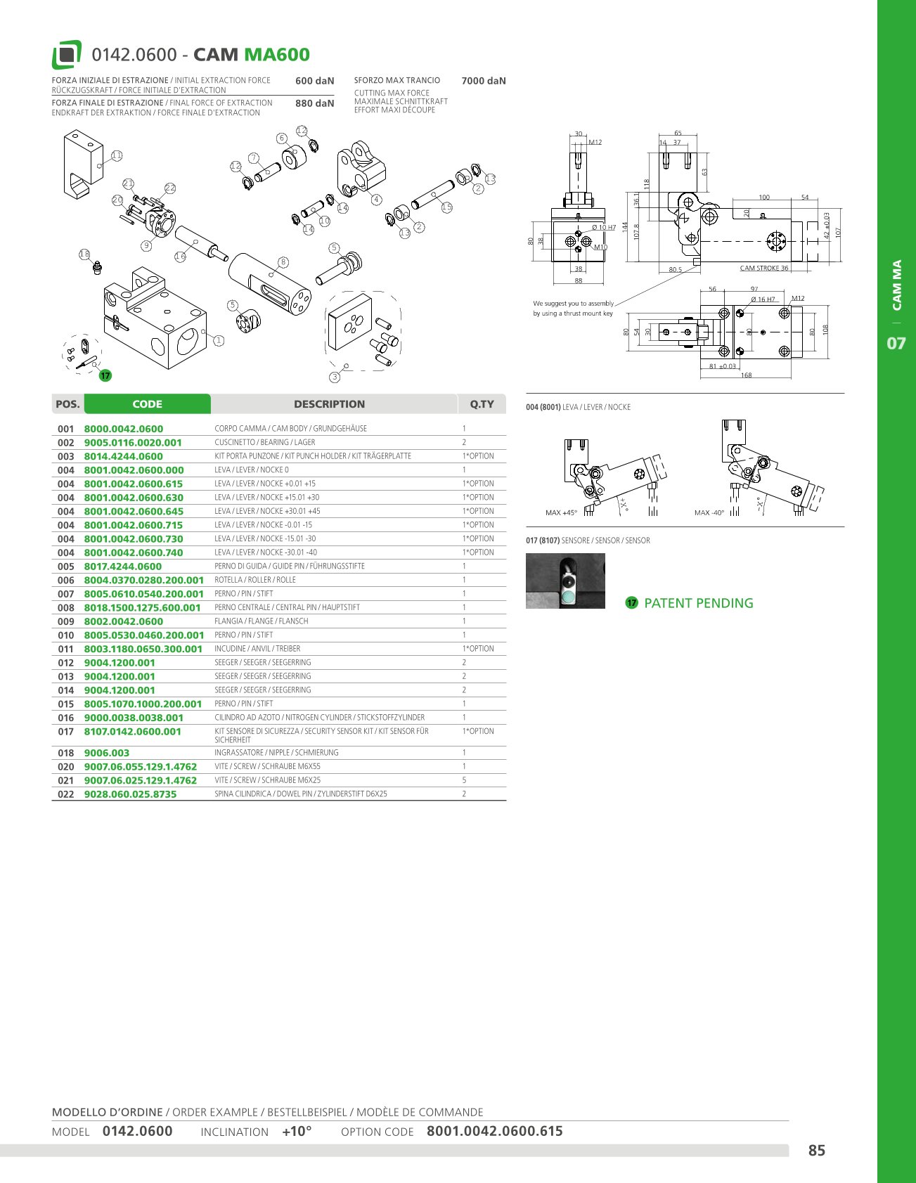 Camma meccanica di potenza fino a 10000 daN con ritorno garantito mediante una molla ad azoto, su cui vengono applicati gli accessori o gli acciai per eseguire le lavorazioni desiderate. È dotata di una struttura solida e compatta, al cui interno vi è un meccanismo antirotativo di posizionamento. Può essere montata in posizione orizzontale o inclinata (previo confronto con l’ufficio tecnico Newstark).